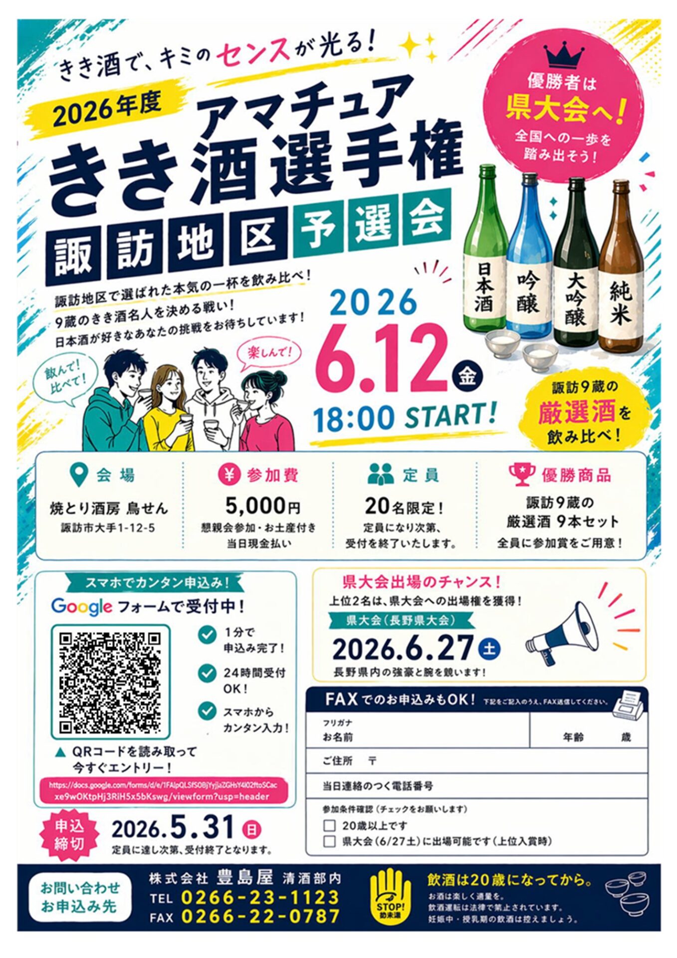 毎年恒例、アマチュア唎酒選手権諏訪地区予選会が、今年も開催されます。ご参加お待ちしております。